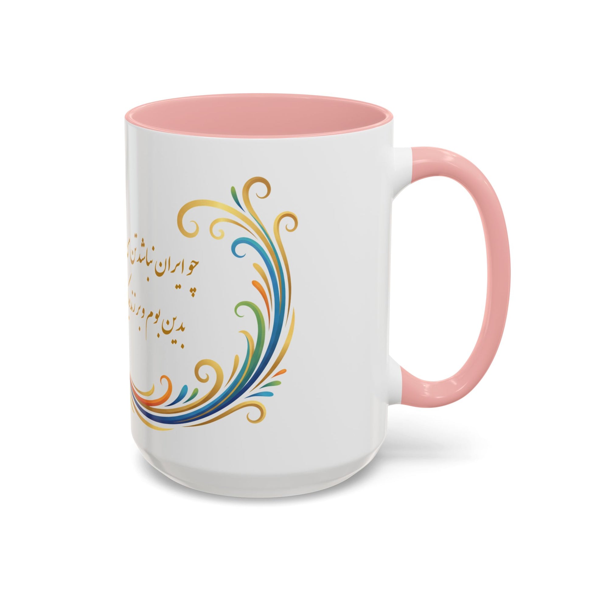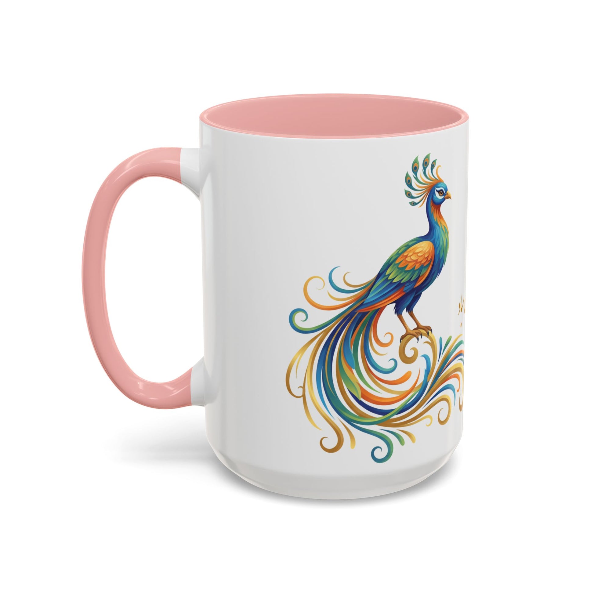 A bright ceramic mug that brings a quiet, poetic moment to your morning ritual. White ceramic with a soft pink interior and handle frames a flowing, hand-painted peacock motif and elegant calligraphic text. The glossy finish and vivid printing make each color pop, while the comfortable C-shaped handle and two size options let you sip slowly or stock up for long work sessions. It settles easily into a cozy kitchen or a sunlit desk, lending color and calm to coffee, tea, or a favorite warm drink.