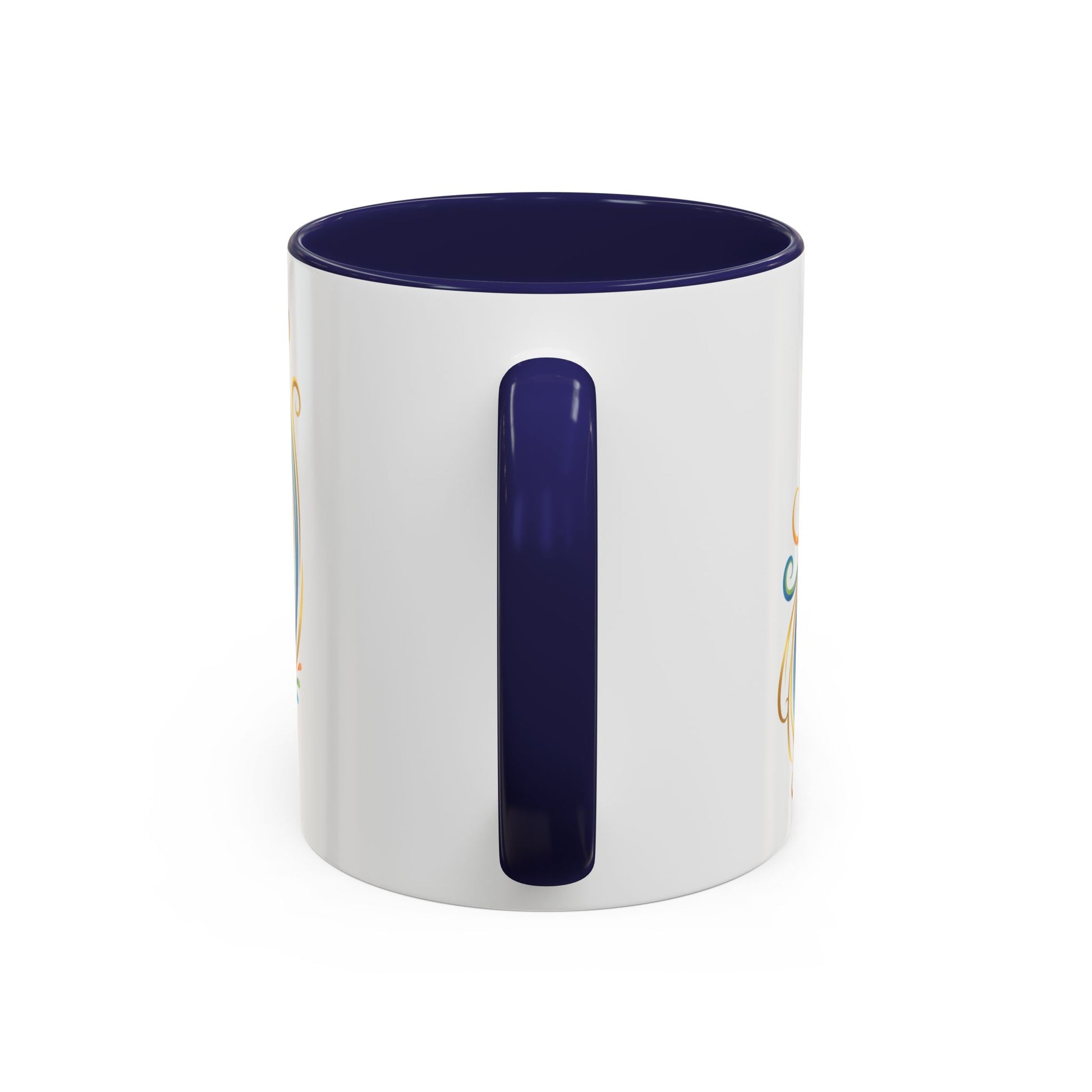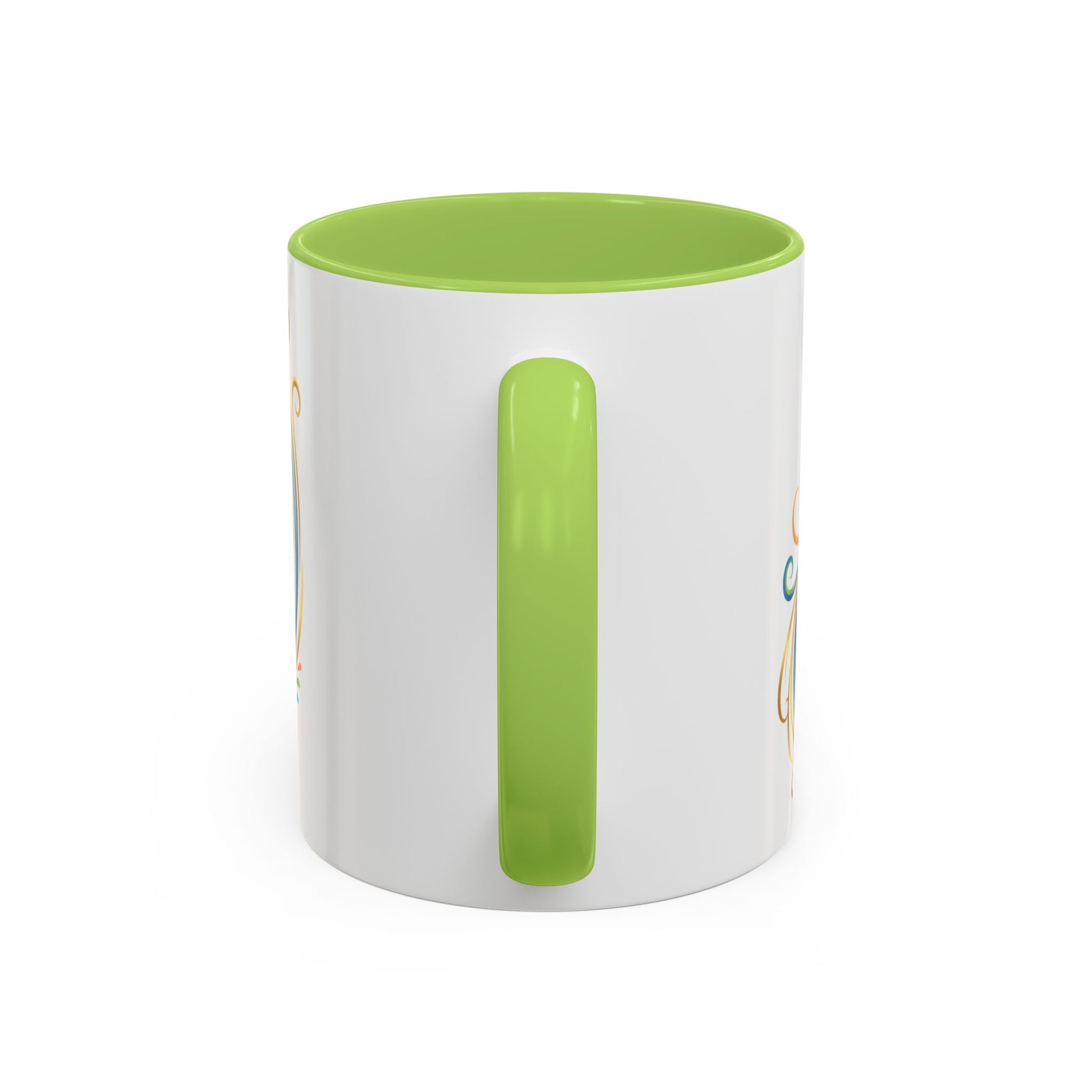 - White ceramic body with colored interior and C-shaped handle