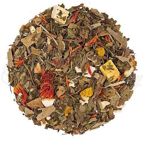 Peppermint, ginkgo leaves, orange pieces, turmeric, pumpkin, safflower petals