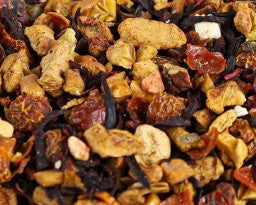 Ingredients: Apple*, Hibiscus petals*, Rosehip*, Lemon peel*, Strawberry leaves*, Camomile*, Cornflower petals*, Raspberry pieces*, Natural flavors. (Organic compliant)